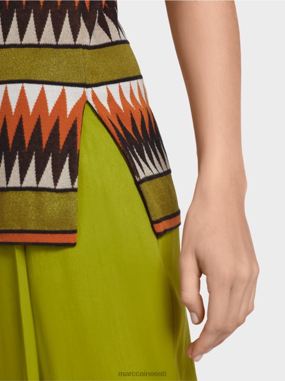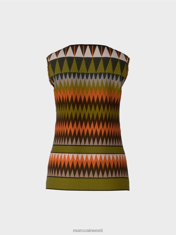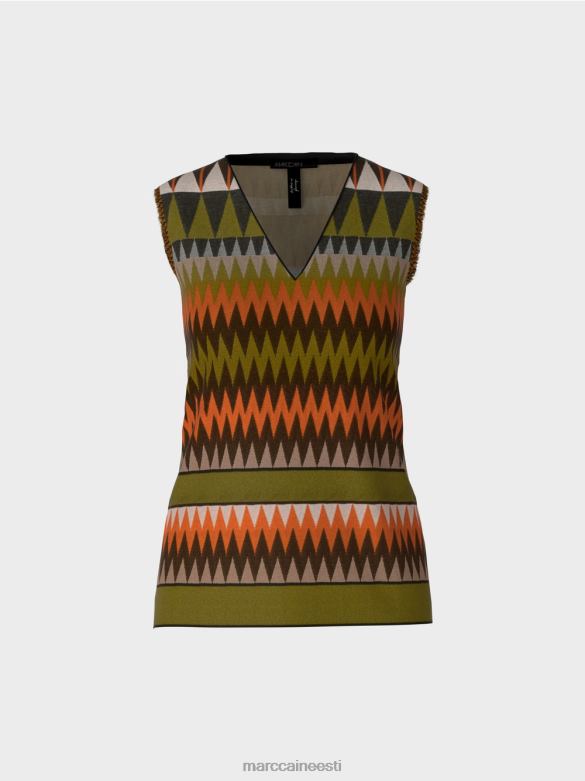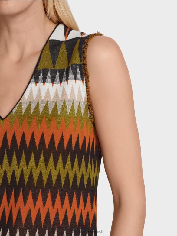 Selle Varrukateta Silmkoelise Kampsuni Kujundust Iseloomustavad V-kaelus Ja Lõhikud Küljel õmblus. Intensiivsed Seitsmekümnendate Värvid Ja Siksakmuster Loovad Elava Ilme, Mida Täiustavad Käeaukude Lahedad Narmad. Kampsun On Kootud Ja Viimistletud Meie Ruumides Saksamaal. üksikute Tükkide Edasist Töötlemist Teostavad Meie Partnerettevõtted Euroopas. See Muudab Eseme "kootud Saksamaal".