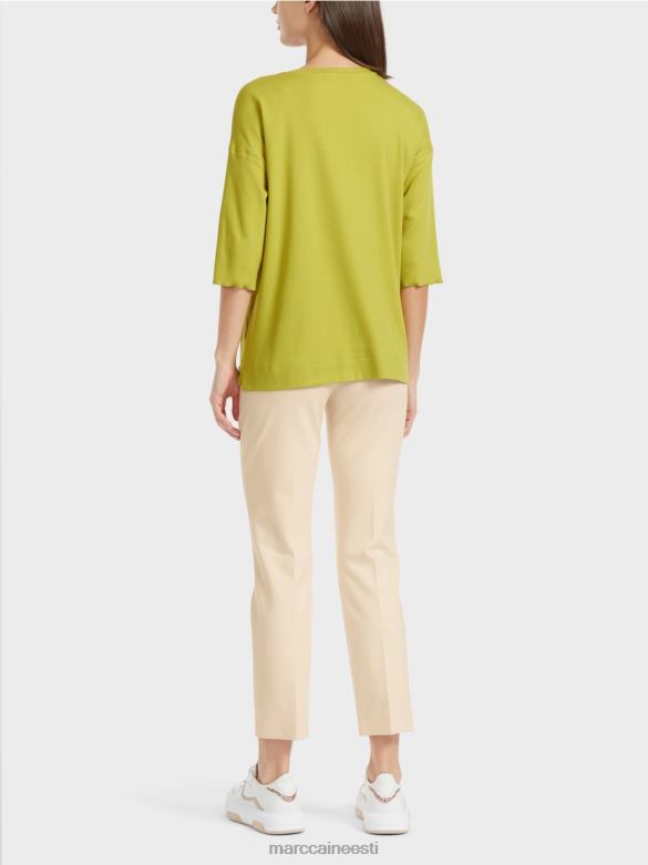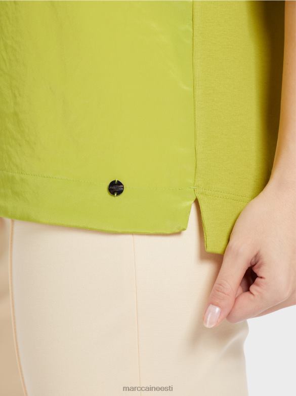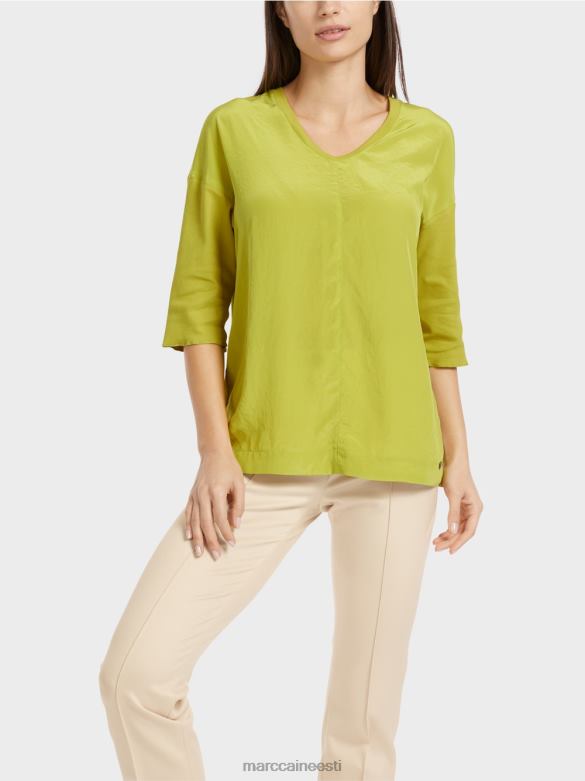 See On Materjalide Segu, Mis Annab T-särgile Pluusilaadse Tunde: Seljaosa Ja Varrukad On Painduvast Trikoost, Esiosa Aga Pehmelt Voolavast Kangast. Kaelus On ääristatud Soonikuga. Pluusi Kuju On Naiselik: Alustades Kitsast õlast Ja Varrukast, Keha On Kergelt Laienev. Alläär On Rõhutatud Väikeste Küljelõhikutega.